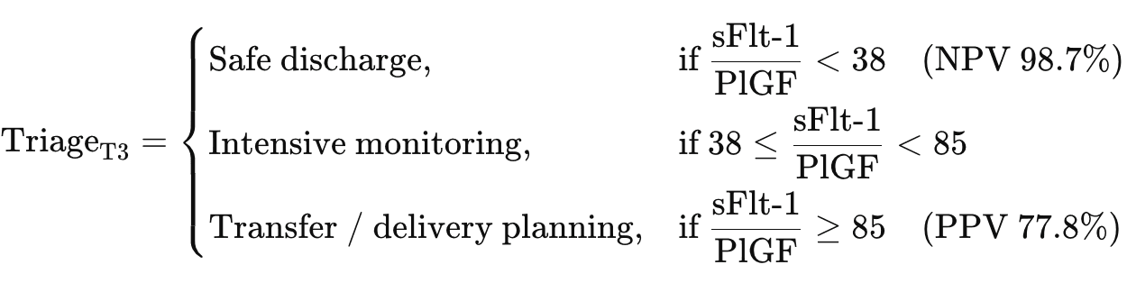 >28 weeks | sFlt-1/PlGF (suspected cases) | Discharge (<38) vs Transfer (>85) | Ob Triage decision support |