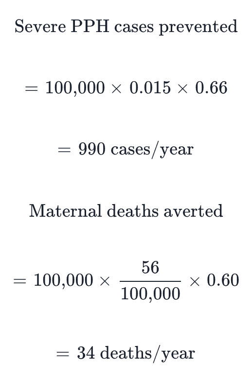 With 60-66% reduction in severe PPH through AMTSL implementation (Begley et al., 2019), approximately 990 severe hemorrhage cases and 34 maternal deaths would be prevented annually. At a cost of $113.91 per DALY averted (Williams et al., 2024), the intervention is highly cost-effective.